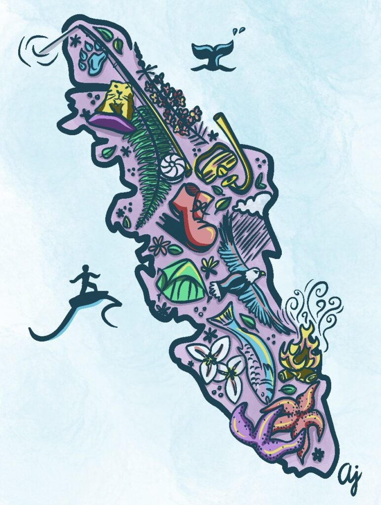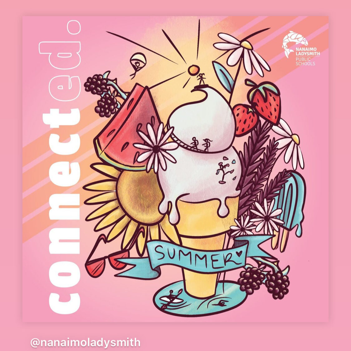 These are a couple examples of my older drawings being brought to life again. I had created the black and white images in one of my daily drawing challenges from previous years. I used the Summer one as my inspiration for the cover of our summer issue of the NLPS ConnectED issue for 2024. I always like the idea of the little people doing summery activities on the ice cream cone and I felt it was a cute idea that kids and families could connect with. The Vancouver Island image was something I would make an awesome sticker so I decided to redraw it recently and I think it turned out really well!