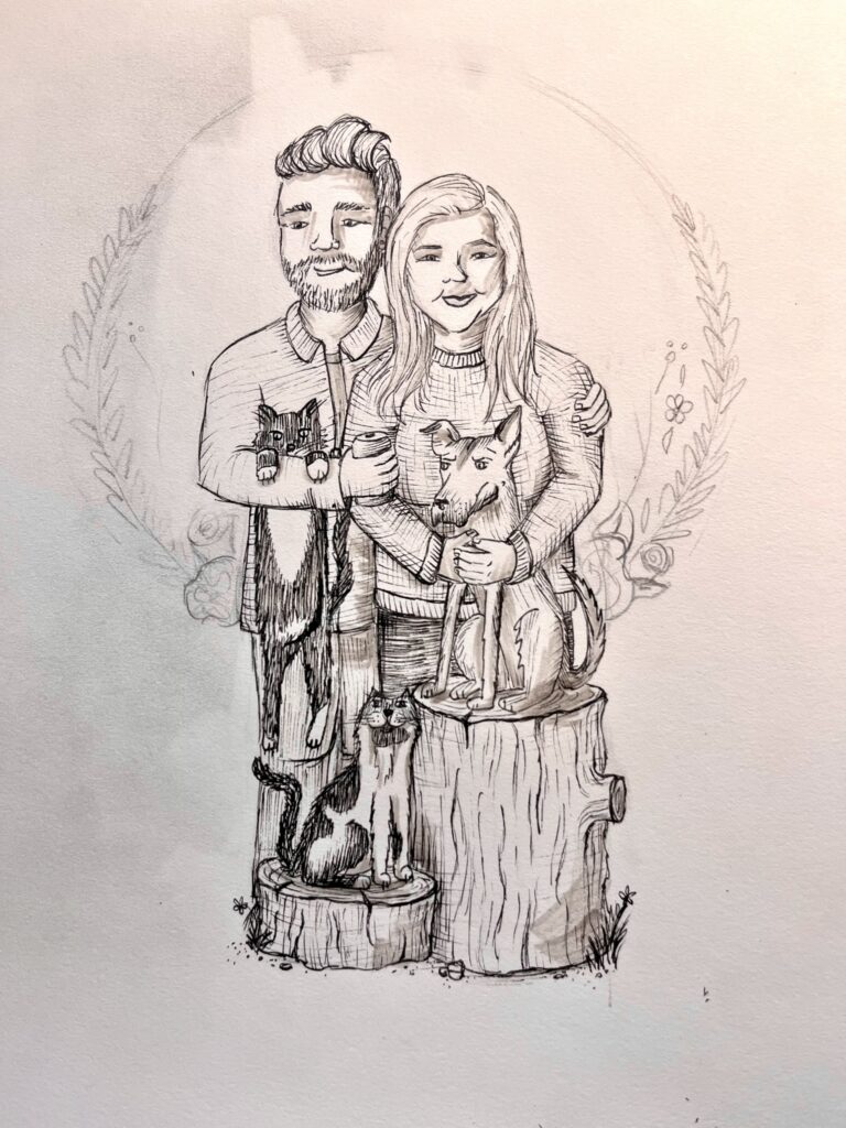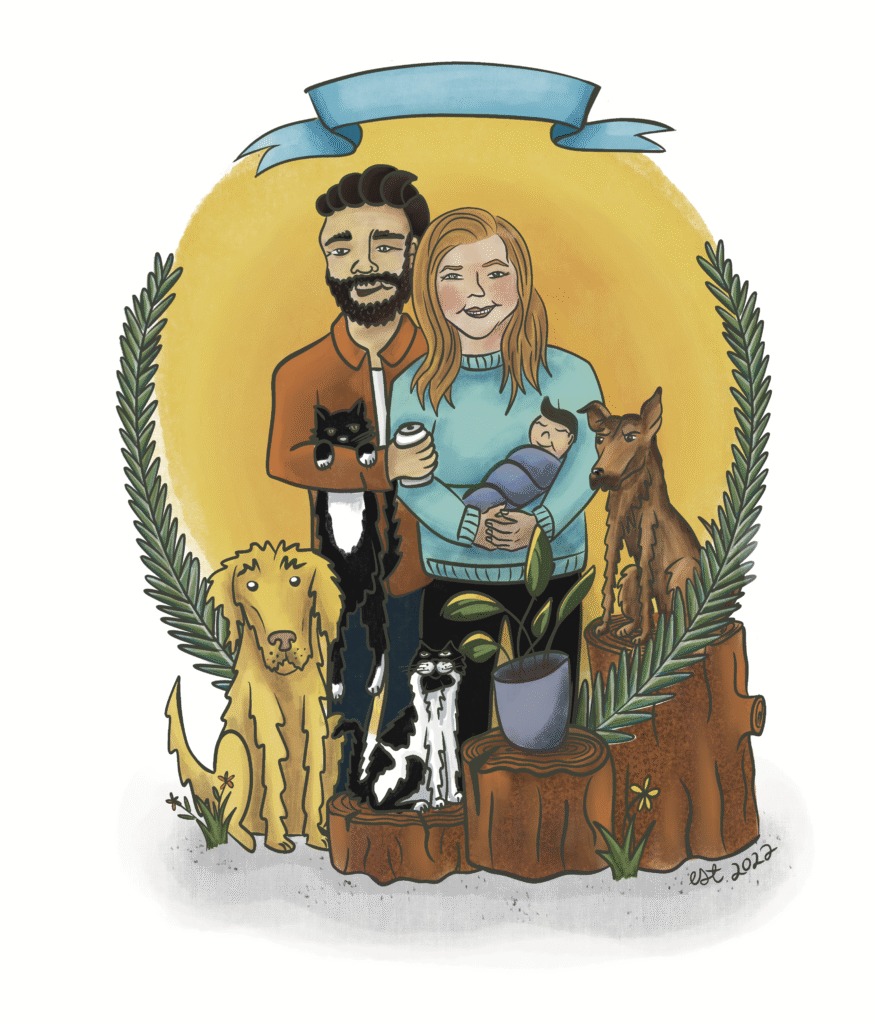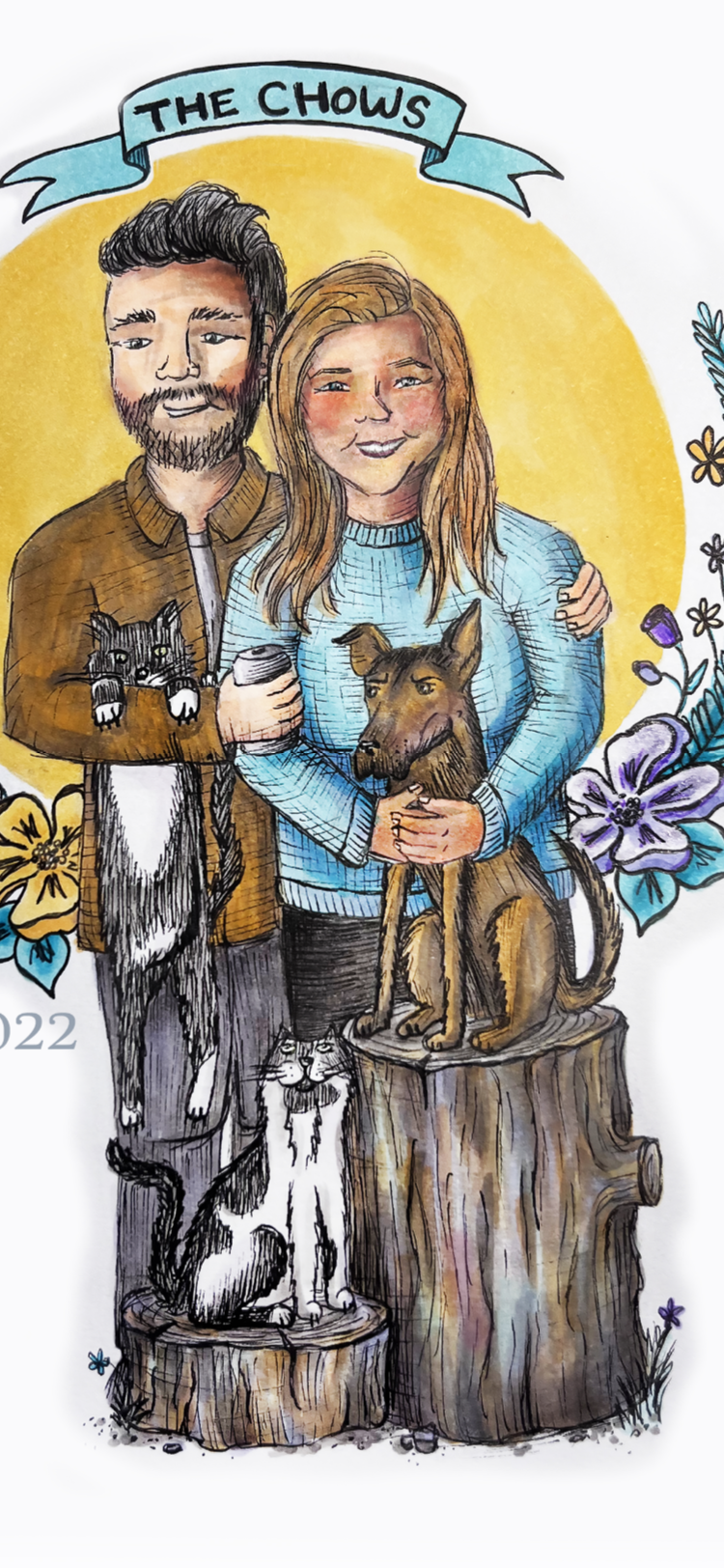 This project was a wedding gift, which turned int a baby shower gift. I drew the couple and their fur babies for their wedding as a pen and marker drawing. A year later, they welcomed their baby into the world. I drew the drawing again with a couple additions and room for more. This time I drew it digitally and I found it much cleaner and the print had a really nice finish to it.